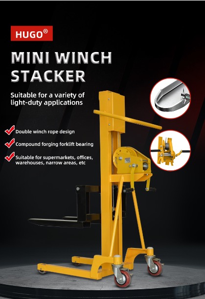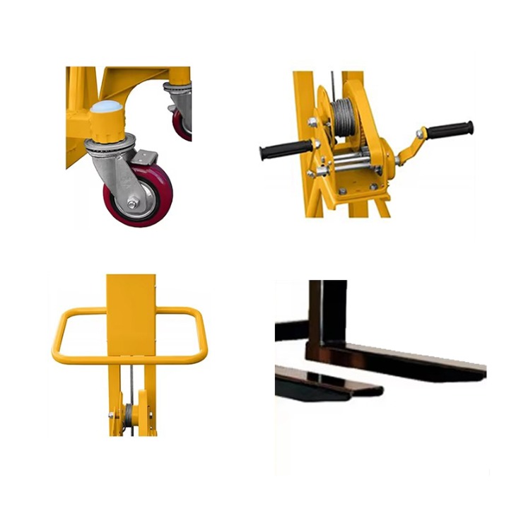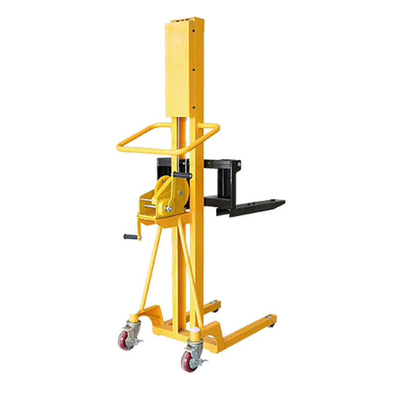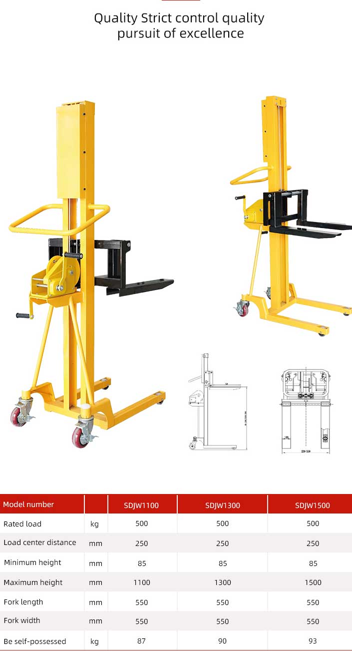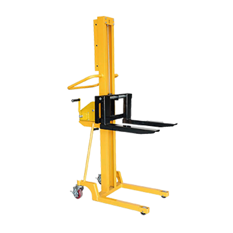 500kg tangan pallet tangan Dengan berputar peranti tangan, pengendali memacu struktur mekanikal dalaman untuk menaikkan atau menurunkan garpu kargo, dengan itu mencapai operasi penyusunan stacker.